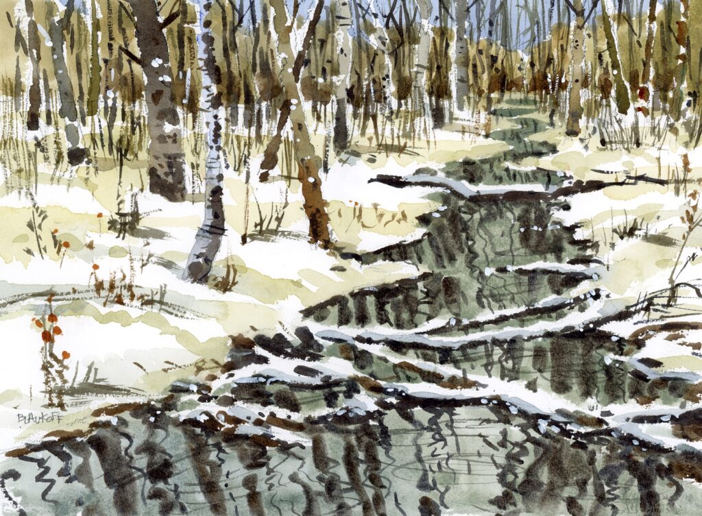 Given the north’s often unpredictable weather, and long stretches of overcast skies, there’s no reason to wait for “ideal” painting conditions. There is, in fact, plenty of pictorial drama and beauty even on cloudy days. Plus, there’s the added opportunity to create your own mood and atmosphere through subtle modulations of colour. In this one-hour streaming demo, watch Shari Blaukopf paint a landscape of snowy winter woods and watery reflections on an overcast day. She’ll show you how to plan the composition, select a limited palette for the winter trees and icy stream, and work from large areas to small details.