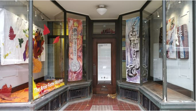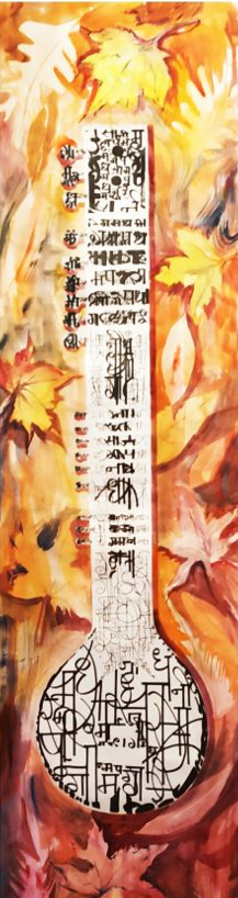 Bhairavi was invited to display music-related art at Hamilton’s heritage site in the Anne Foster Windows. This display is up from Oct 2021- to Feb 2022. There are different artworks including, two banners created in watercolors sized 50x 70 inches. These banners consist of Calligraphy in the shape of Indian musical instruments on the background of Fall and winter scenes. This art is commissioned for Anne Foster Windows by Hamilton Tourism and culture division. (Ink was used for Calligraphy)