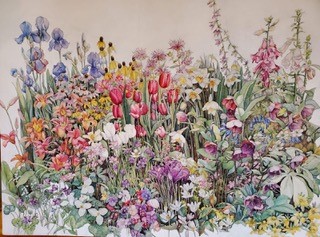 The painting shown below, after being called the Pandemic Painting because It took me many months to finish over the last two years is now properly named “Bountiful”. It is a compilation of most of the flowers grown in our garden over the last fifty some years and everything yellow is painted with Aureolin, from the palest to the richest hues. Many of the whites are touched with the sunlight of Aureolin. “