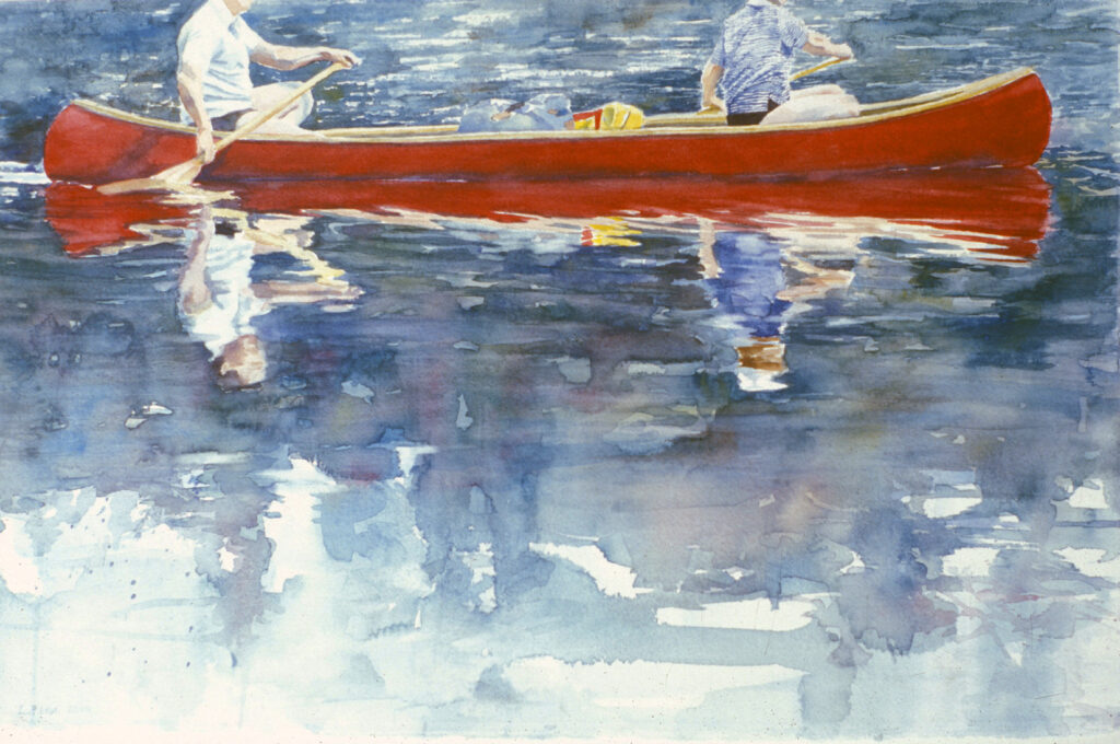 “Here is one of my favourite paintings, done in 2001, of my husband and me on a canoe trip on the French River. Titled ‘Balance’, it was painted on a full sheet of Arches 300 lb. CP paper. Water, especially reflections in water, continue to be a source of inspiration for me.”